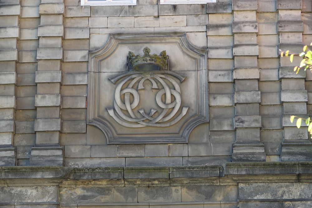 Hier eine unleserliche Inschrift in der Burgfassade in luftiger Höhe.