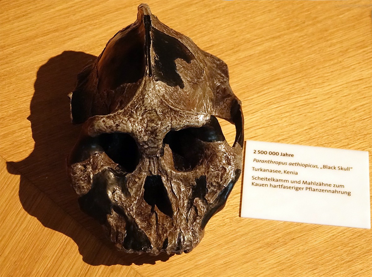 Der Abdruck eines kenianischen Schädels mit Kamm, der unter der Bezeichnung paranthropus aethiopicus "gehandelt" wird, soll von Knochenresten herrühren, deren Datierungen rund 2,8 bis 2,3 Millionen Jahren zurückreichen. Der auch als "Black Skull" bezeichnete Schädel wurde 1985 westlich vom Turkana-See gefunden.