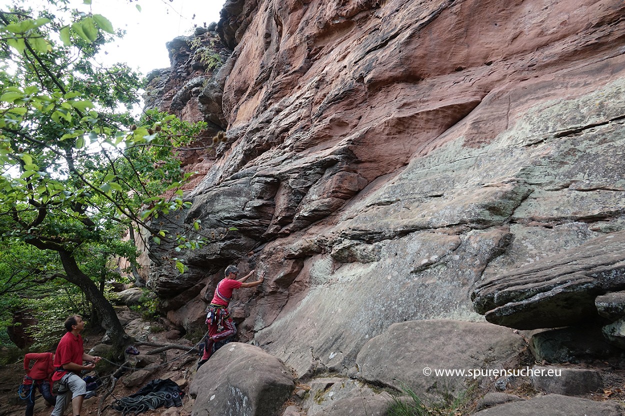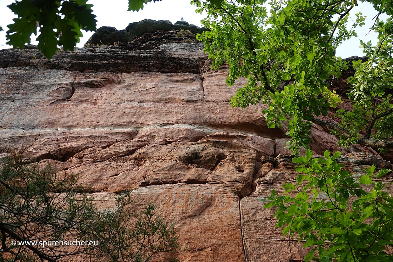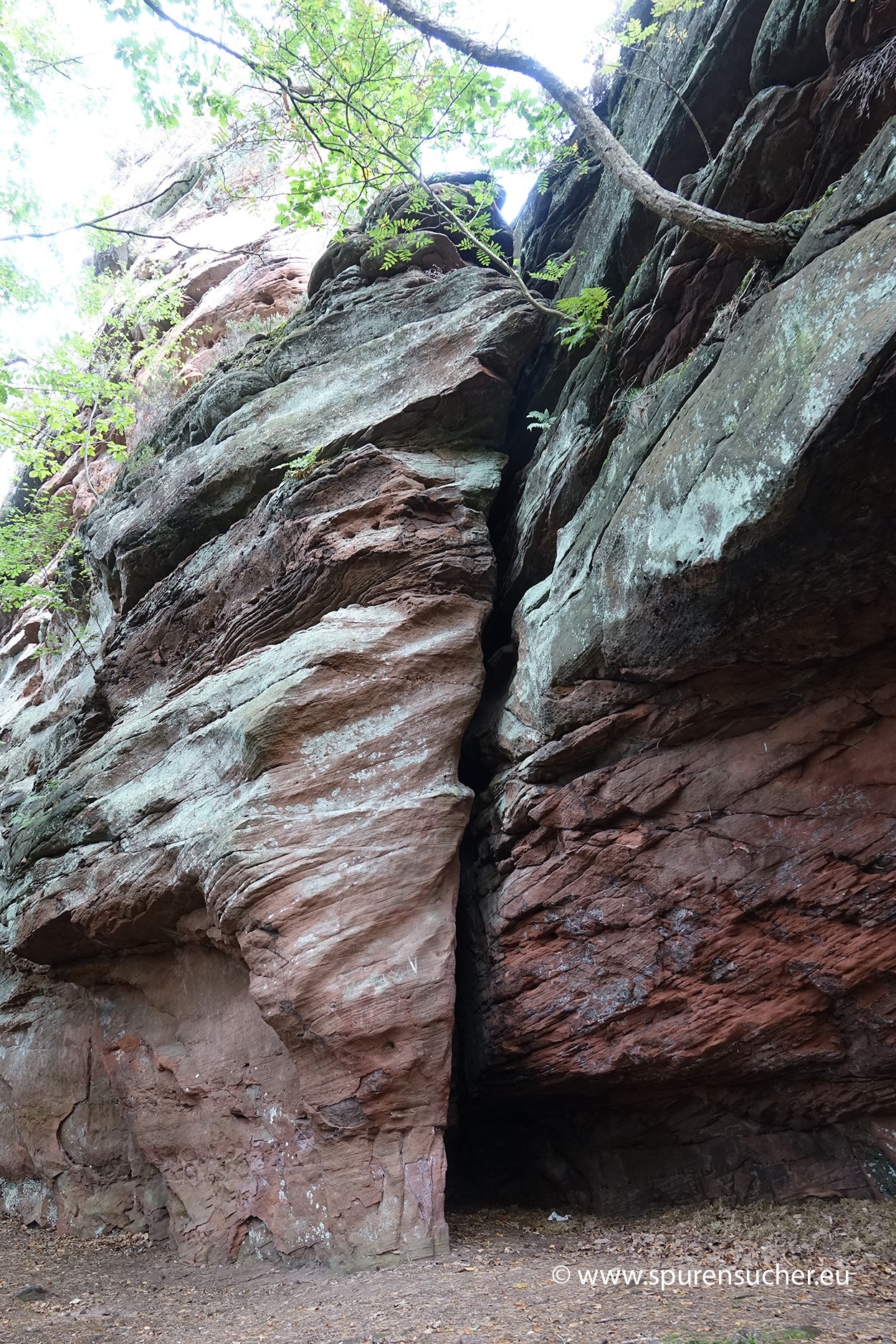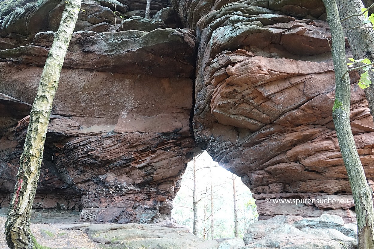Hauenstein im Pfälzerwald ist für seine bizarren Bundsandsteinfelsen bekannt. Allerdings darf man sich nicht auf eine Beschilderung dorthin verlassen, wenn man das unter den ausgefallenen Sichtungen bekannte "Felsentor" sucht. In den Suchmaschinen findet man unter dem Stichwort nur ein in näherer Umgebung liegendes gleichnamiges Hotel. Etwa 500 Meter vom Felsen entfernt fragte ich Schüler, ob sie mir weiterhelfen könnten. Ich erkannte sofort, dass es Einheimische waren. Trotz ihrer Bemühungen konnten sie mir den Weg dorthin nicht zeigen.