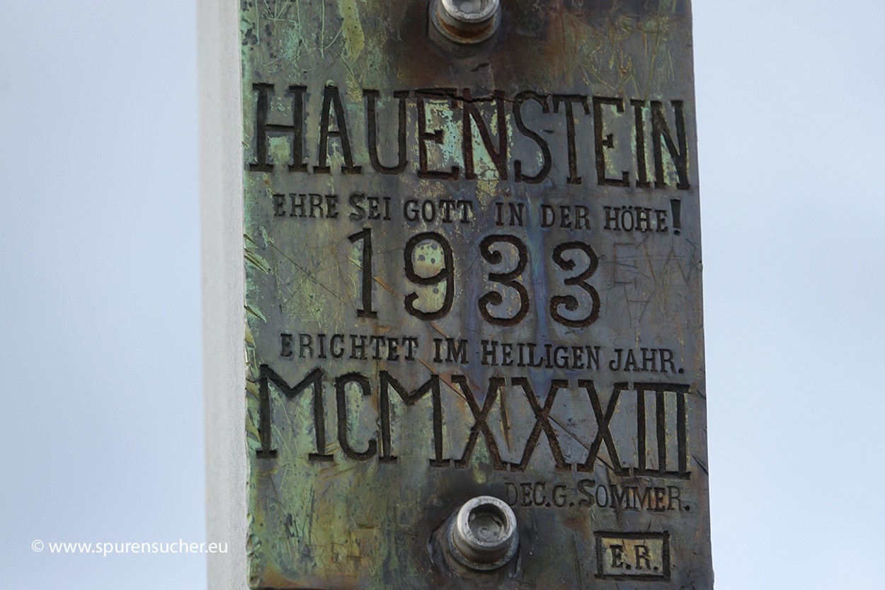 Das Gipfelkreuz als stilisiertes Sonnensymbol mit der dazugehörigen Beschriftung erschien mir an dieser Stelle auch als etwas ungewöhnlich. Warum gerade im Jahr der Machtergreifung von Hitler dieses Schild aufgestellt und in Ehren gehalten wurde, erschließt sich mir nur durch eine Quelle der Welt, in der behauptet wurde, Hauenstein habe seinerzeit buchstäblich ein Bollwerk gegen die Nazis errichtet. Im Disput zweier Nachbardörfer spricht man von „Kreuzköpfen“ versus „Lutherköpfen“. Hauenstein war streng katholisch, das Nachbardorf Darstein protestantisch. Ob sich hier in Wirklichkeit jedoch andere gegenläufige Strömungen aufgerieben haben, ist nicht auszuschließen.