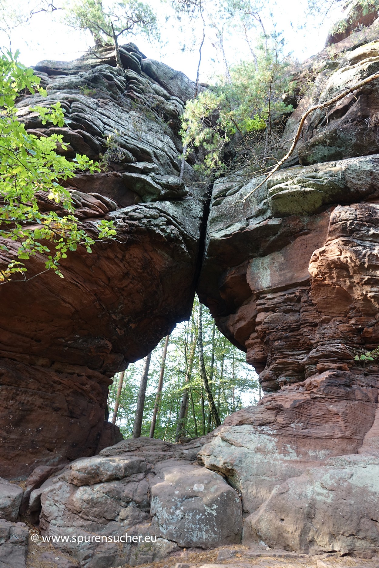Hauenstein im Pfälzerwald ist für seine bizarren Bundsandsteinfelsen bekannt. Allerdings darf man sich nicht auf eine Beschilderung dorthin verlassen, wenn man das unter den ausgefallenen Sichtungen bekannte "Felsentor" sucht. In den Suchmaschinen findet man unter dem Stichwort nur ein in näherer Umgebung liegendes gleichnamiges Hotel. Etwa 500 Meter vom Felsen entfernt fragte ich Schüler, ob sie mir weiterhelfen könnten. Ich erkannte sofort, dass es Einheimische waren. Trotz ihrer Bemühungen konnten sie mir den Weg dorthin nicht zeigen.