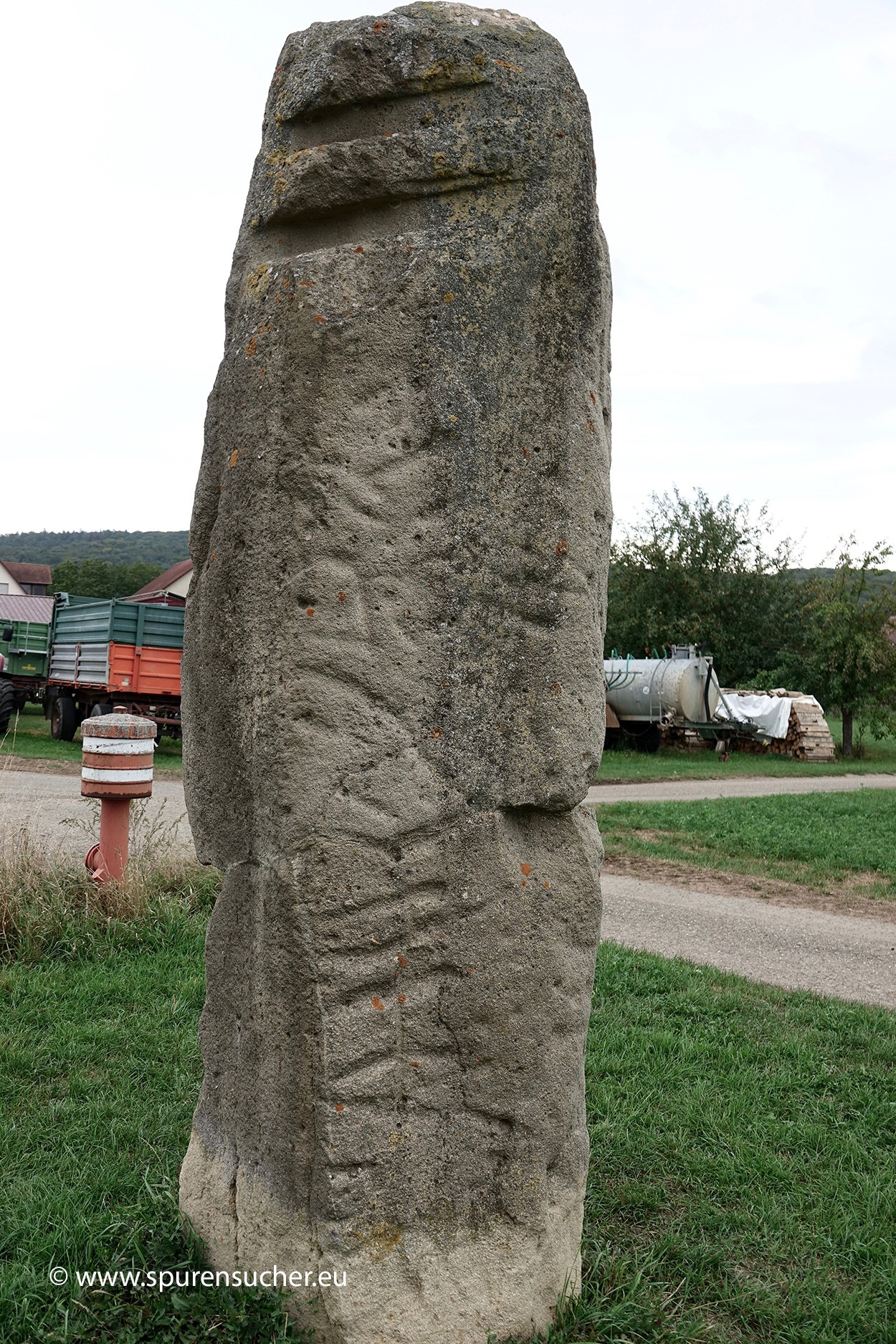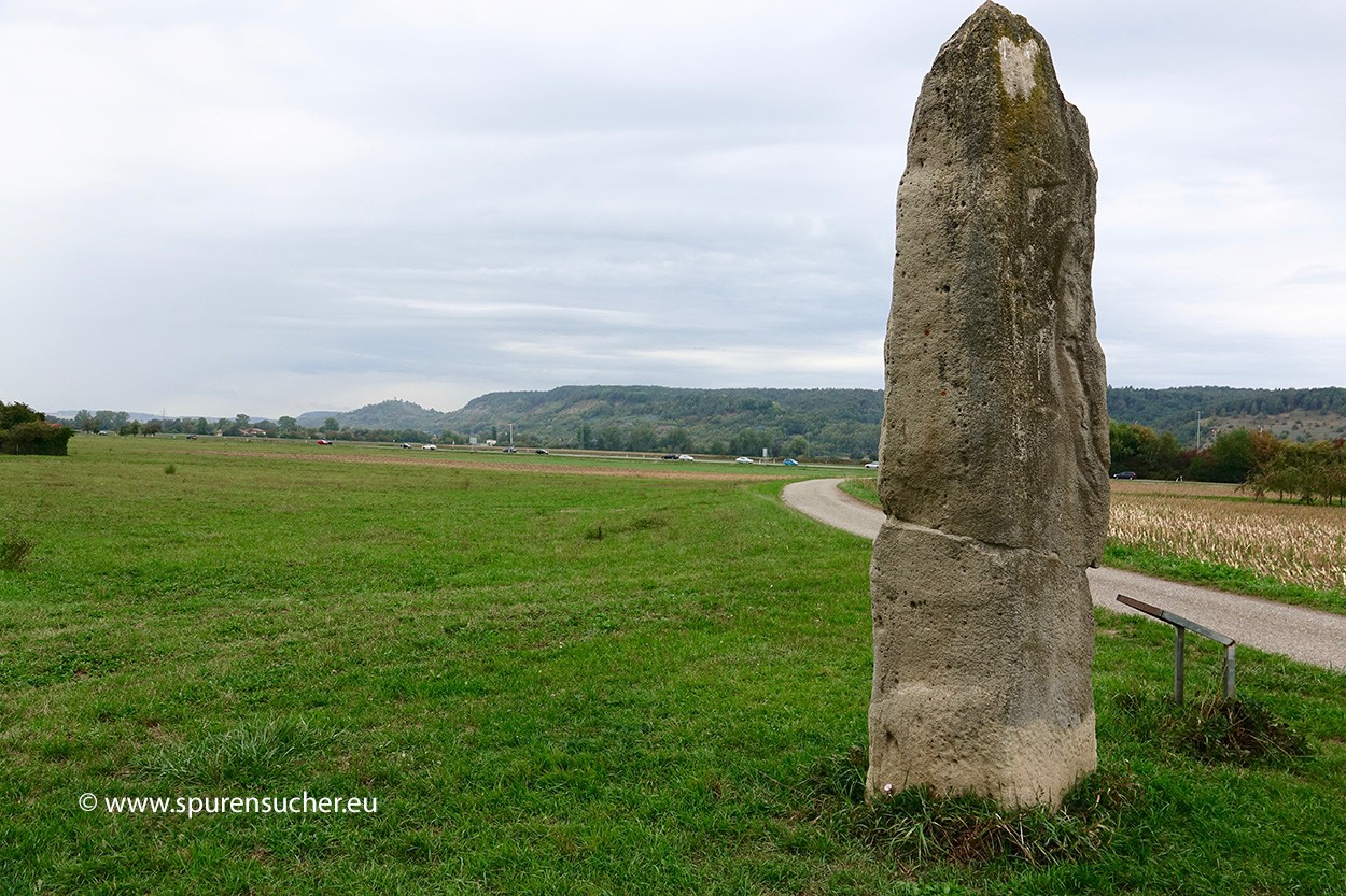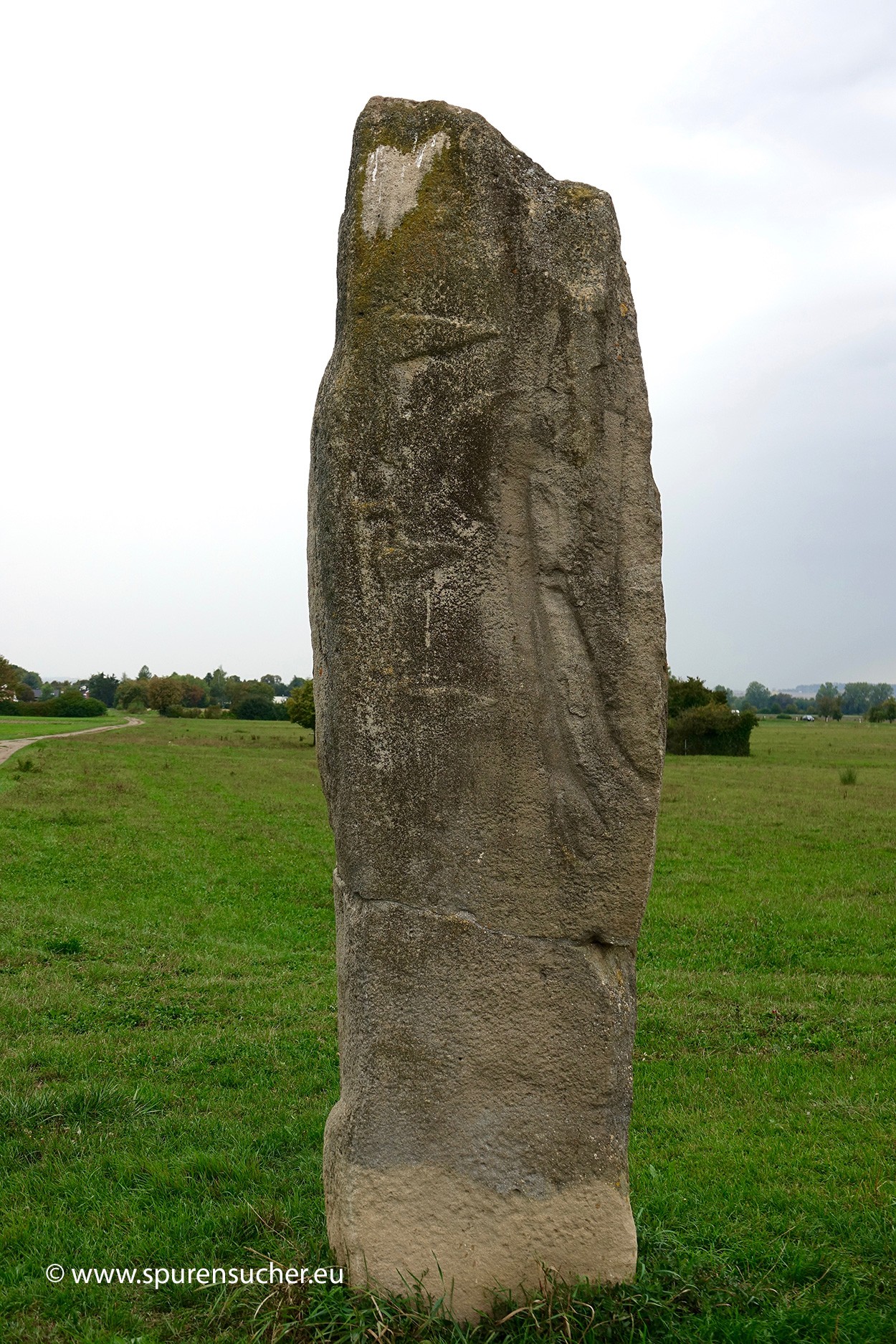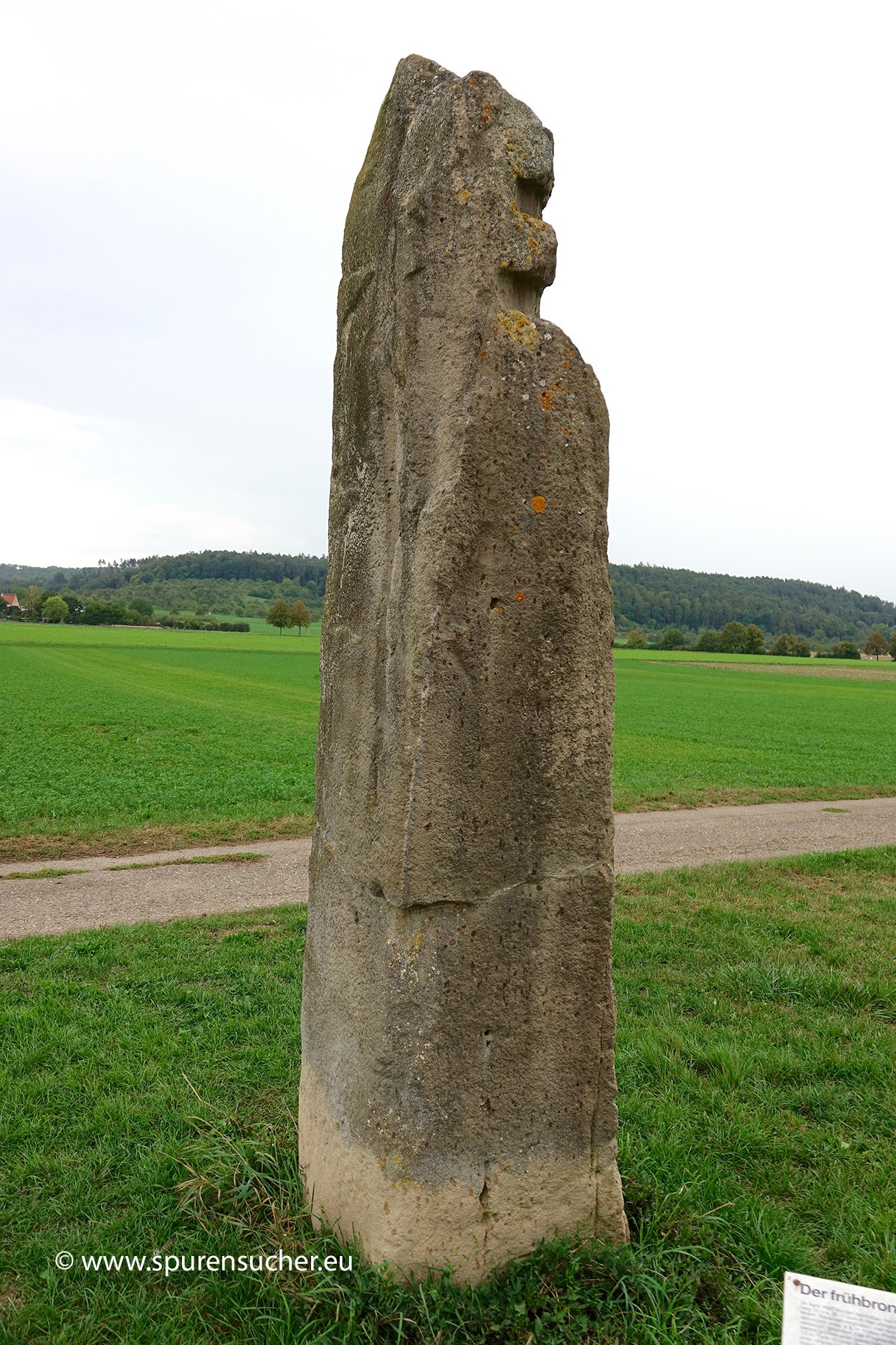 Das Vermächtnis aus Stubensandstein wurde 1985 bei Bauarbeiten gefunden - allerdings in zwei großen und weiteren kleinen Teilen. Was wir hier sehen ist leider kein Original, sondern ein Replikat. Das Original steht im Archäologischen Landesmuseum Baden-Württemberg in Konstanz. Offenbar hat der ursprünglich etwa 4,50 m hohe Menhir kräftig unter der Ausgrabung oder der horizontalen Lage unter der Erde gelitten.