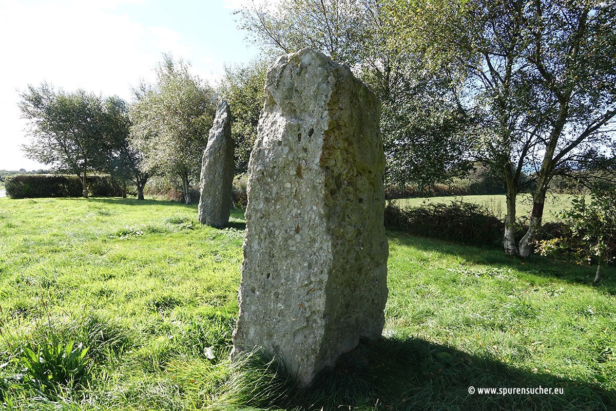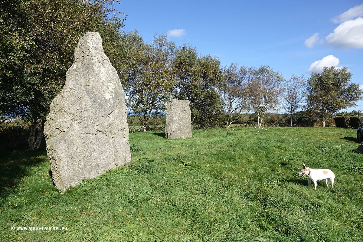 An einem Park-/Randstreifen wurden beide bearbeiteten Felsen lustlos zusammen gestellt und man erhält keinerlei Informationen darüber, was man damals vorfand. Die Archäologie spricht von einem Tumulus … Da sie erst 1997 erst wieder aufgestellt wurden, darf man sich fragen, wo sie in der Zwischenzeit lagen.