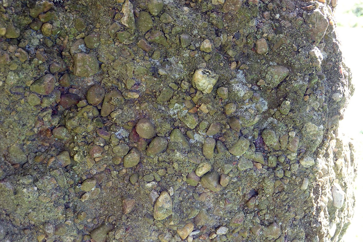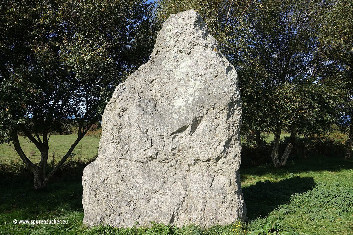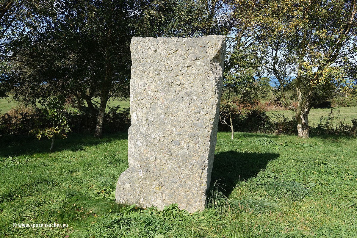 Der dreieckige große Menhir besteht aus "Puddingstein" (sogenannte Konglomerate – grober Kies, der sich zusammen mit Sandstein "zementiert" hat).