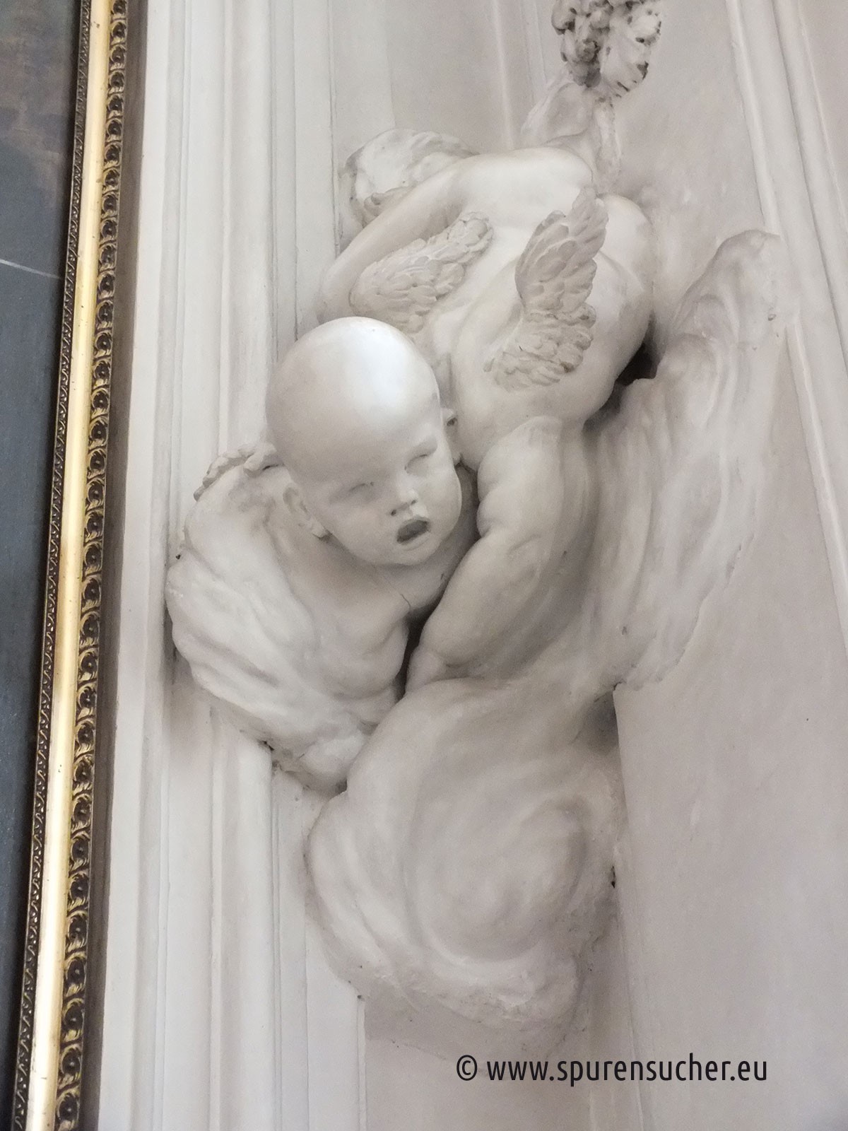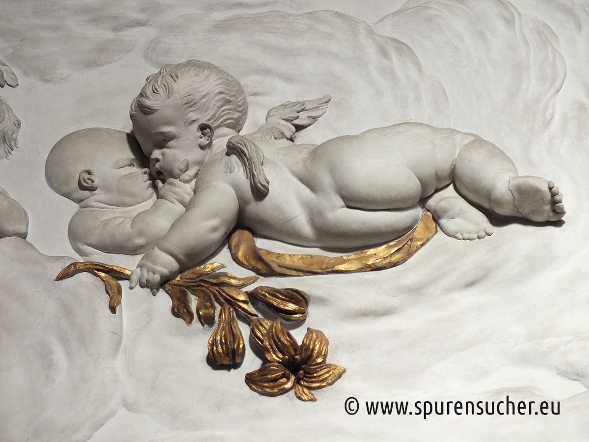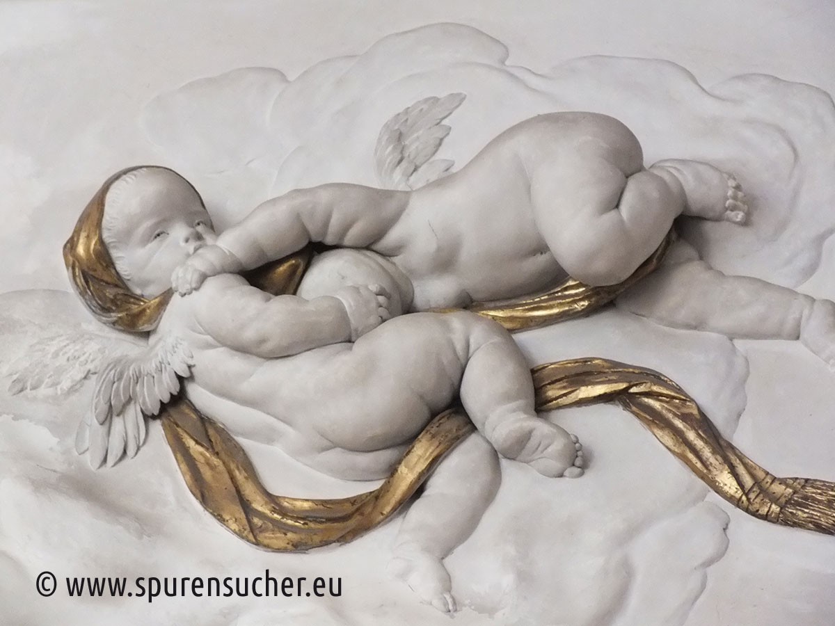 Dieses Puttenpärchen scheint ein ernstes Wörtchen miteinander zu wechseln. Das haarlose Engelswesen (sofern es eines ist, denn es fehlen ihm auch die Flügel) nimmt die Putte ernsthaft in die Mangel.
