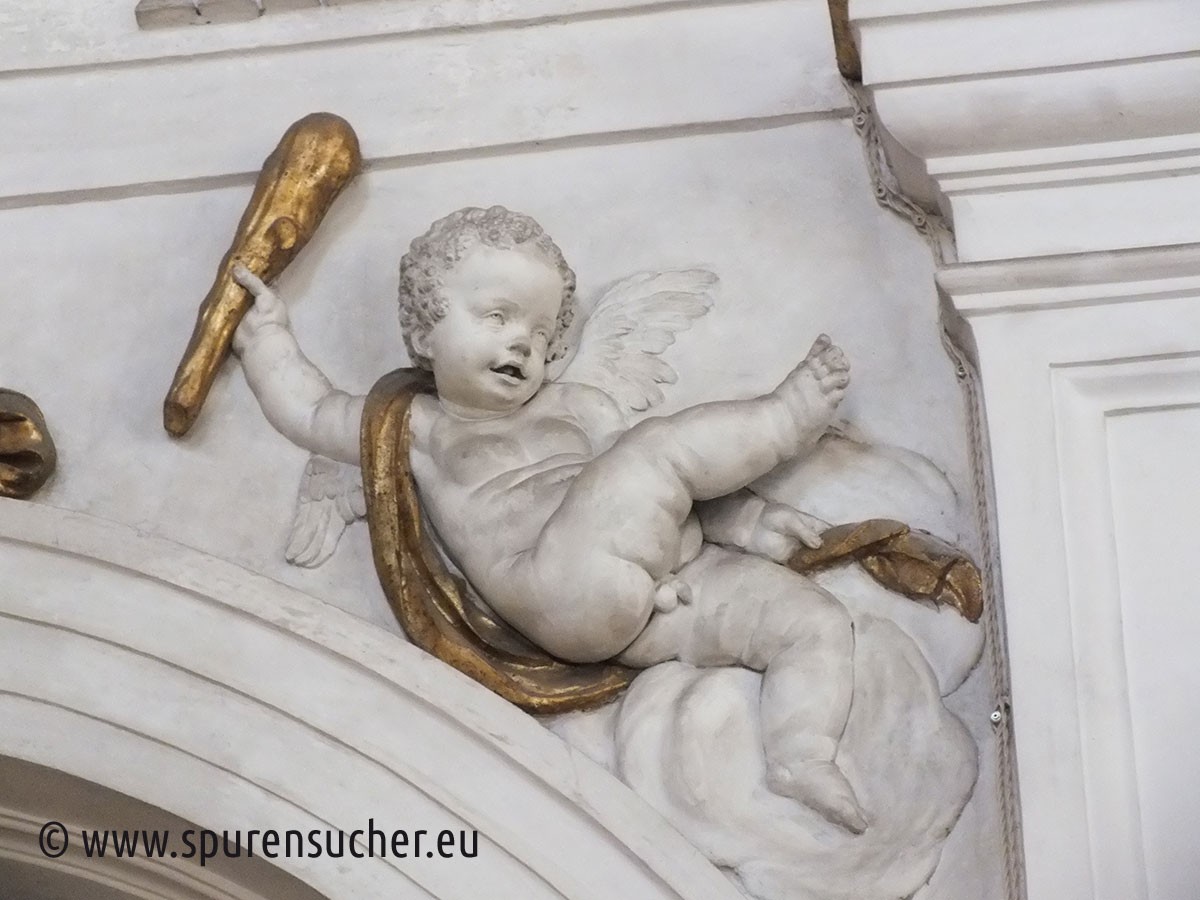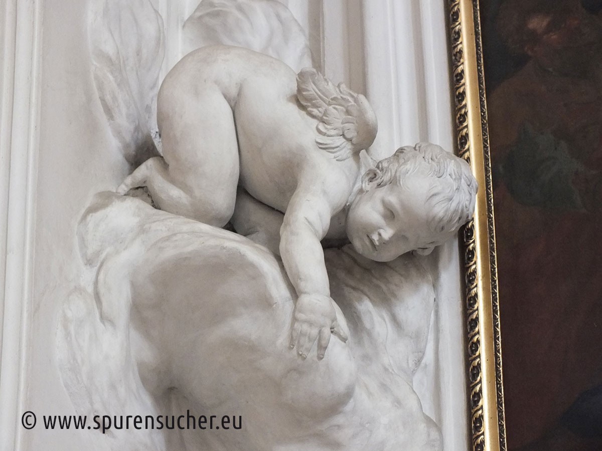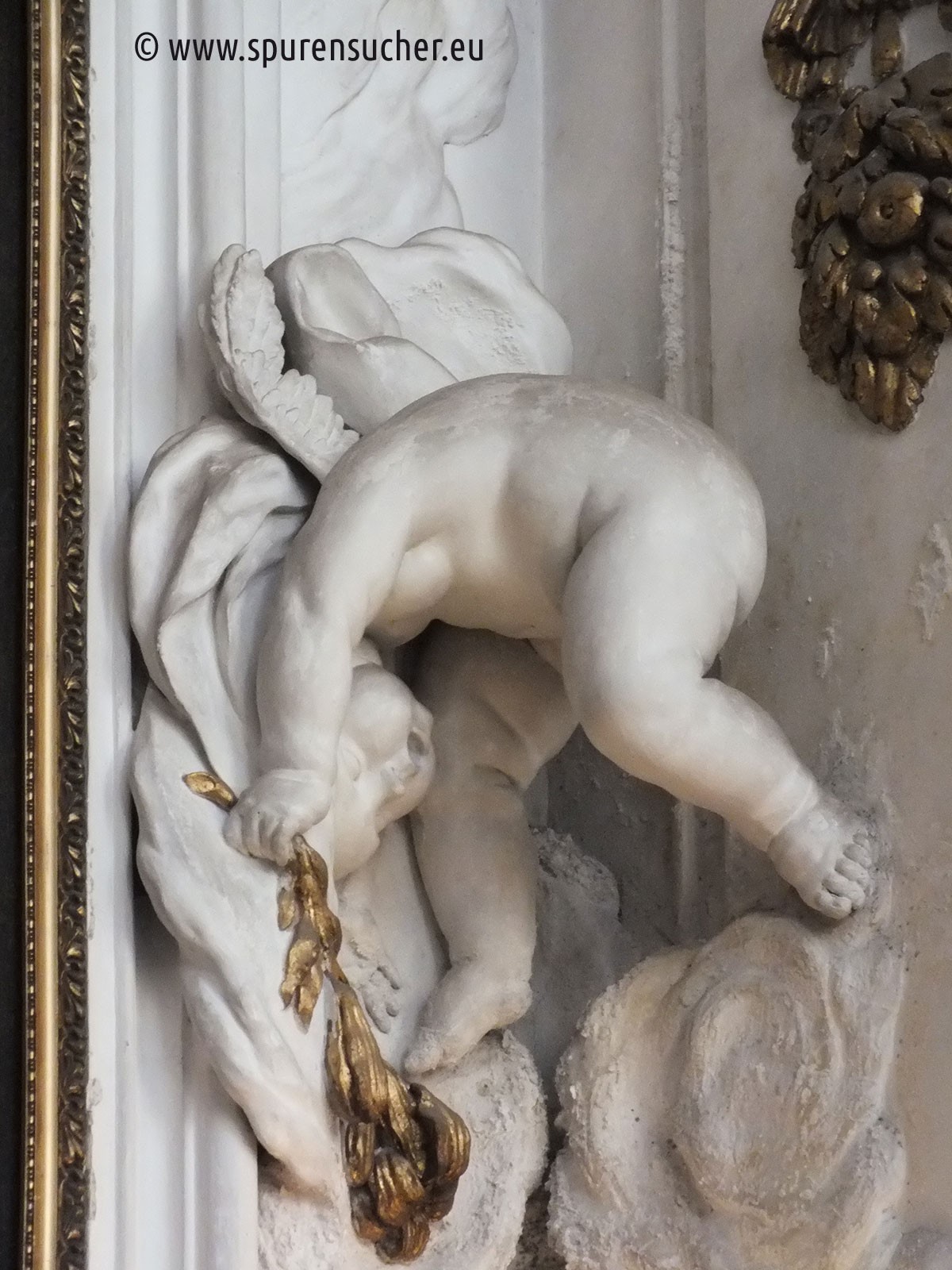 Dieses Puttenpärchen scheint ein ernstes Wörtchen miteinander zu wechseln. Das haarlose Engelswesen (sofern es eines ist, denn es fehlen ihm auch die Flügel) nimmt die Putte ernsthaft in die Mangel.