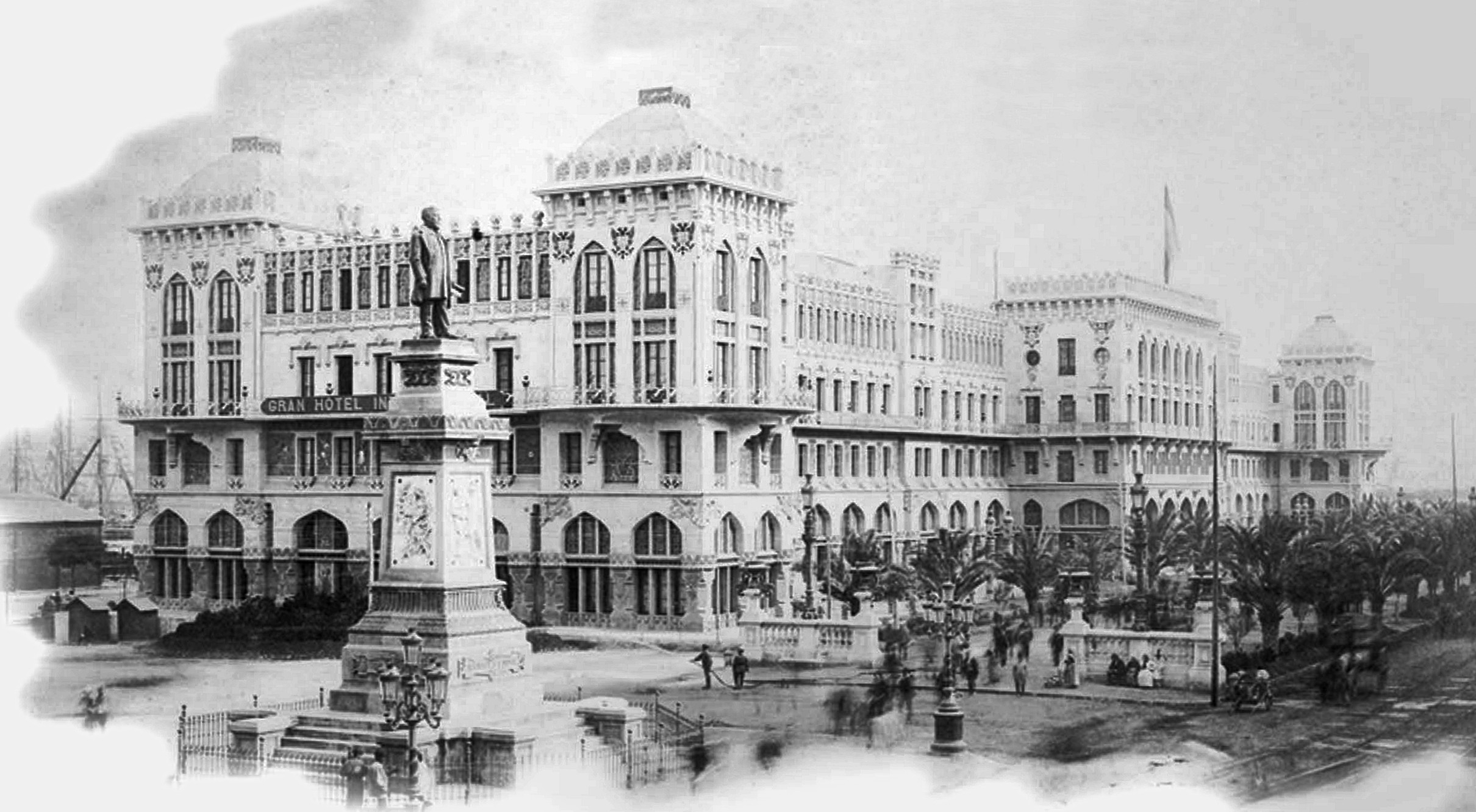 Dieser Palast soll in 56 Tagen gebaut worden sein; das Gran Hotel Internacional in Barcelona; Blick vom Passeig de Colom in Höhe der damals noch nicht bestehenden Via Laietana auf das Hotel. Das Denkmal des Reeders Antonio López im Vordergrund wurde später versetzt.
