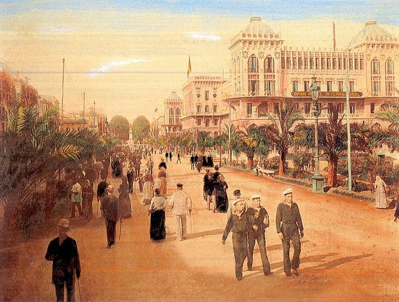 photograph: UnknownUnknown . architect: Lluís Domènech i Montaner (1850-1923) (Transfered by amadalvarez/Original uploaded by Aerocat), Hotel Internacional 1888-des de Monument a Colom, als gemeinfrei gekennzeichnet, Details auf Wikimedia Commons