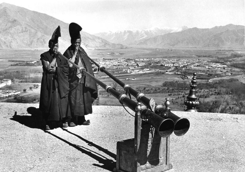 Abbildung: © Bundesarchiv, Bild 135-S-16-12-19 / Schäfer, Ernst / CC-BY-SA 3.0, Bundesarchiv Bild 135-S-16-12-19, Tibetexpedition, Mönche blasen Tuben, CC BY-SA 3.0 DE