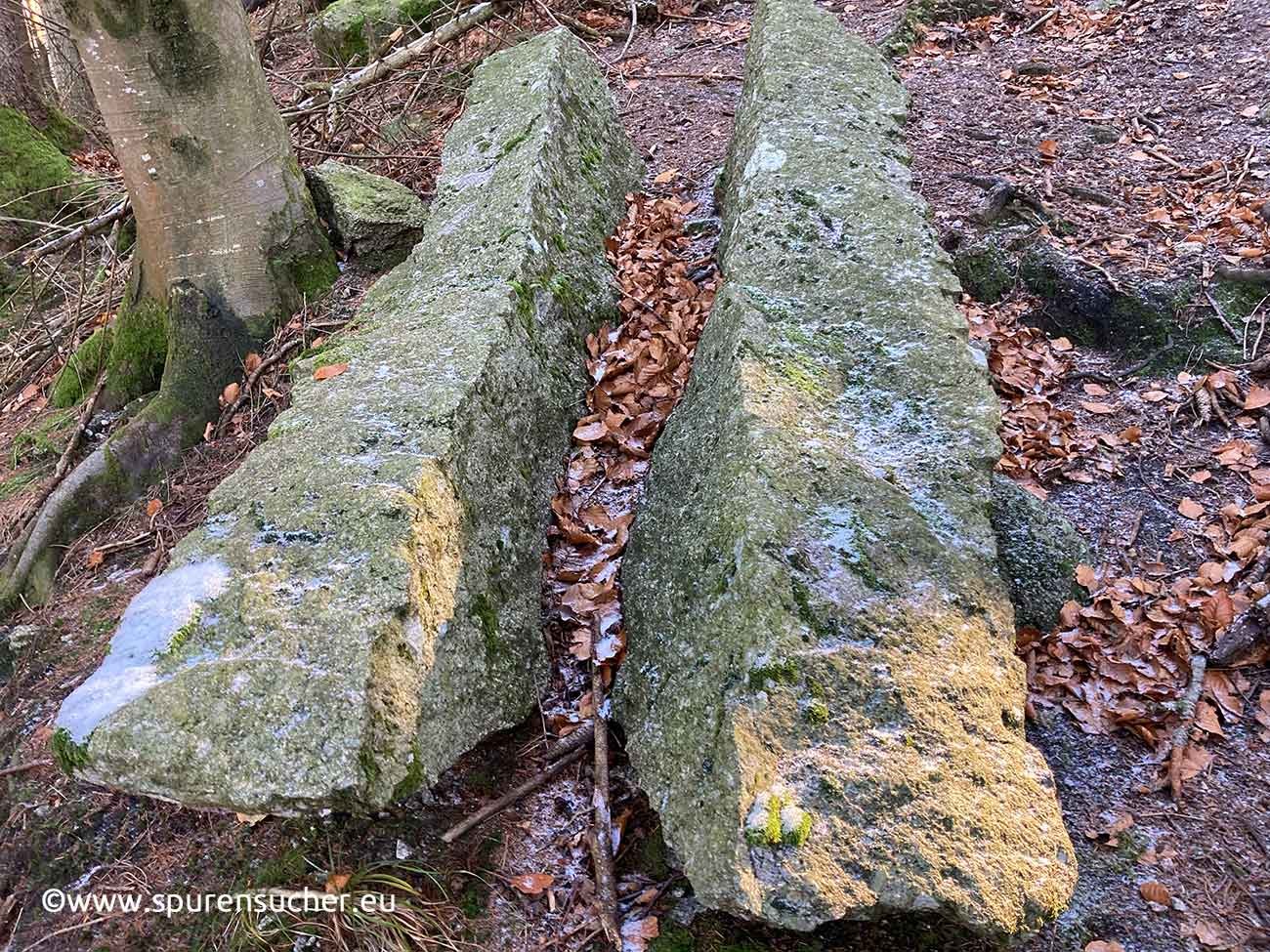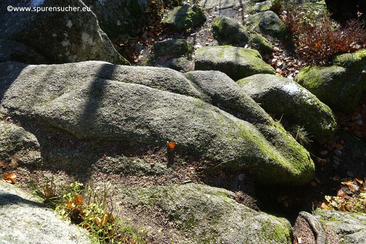 Bearbeiteter Felsen (Runder Kopfabschluss, Schräge). Der vordere Kopfbereich (ggf. mal eine Gesicht?) ist abgebrochen. Seitlich findet man regelmäßige Kerben im Felsen. Schräge, Proportionen haben etwas figürliches.