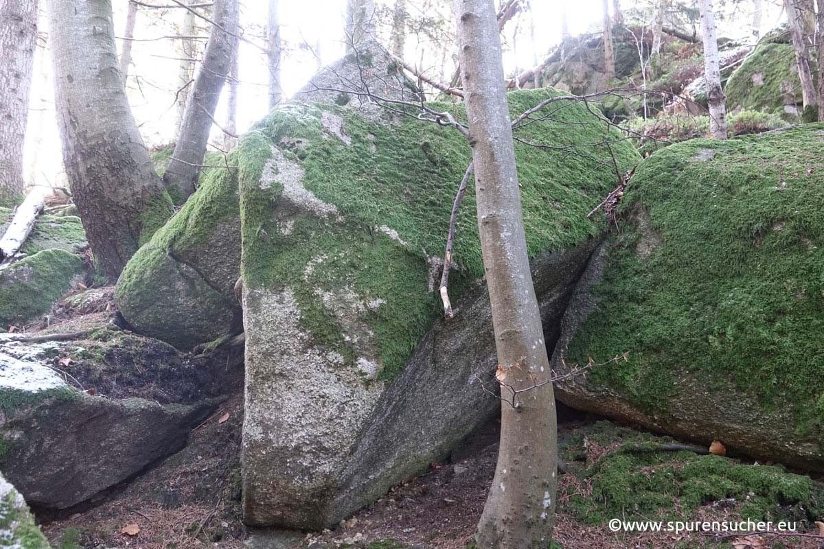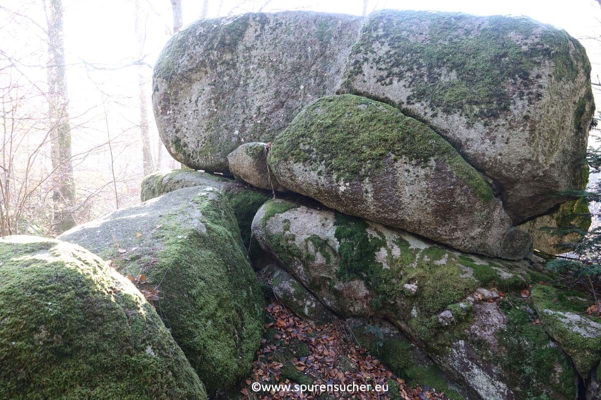 Die Forschung hat für solche Formationen stets die Wollsackverwitterung als Erklärung parat, was für Granit typisch sei. Grobkristalline Strukturen von speziellen Hartgesteinen böten nun einmal die entsprechenden Angriffsflächen bei Klüften für chemisch-physikalische Reaktionen und führten dazu, einen ursprünglichen Gesamtfelsblock in mehrere zu verwandeln. Also laienhaft gesprochen ein Prozess der Auflösung, den uns die Wissenschaft hier verkaufen möchte, um eine statische Herausforderung bei der Auftürmung einzelner Felsen vorsorglich in Abrede zu stellen.