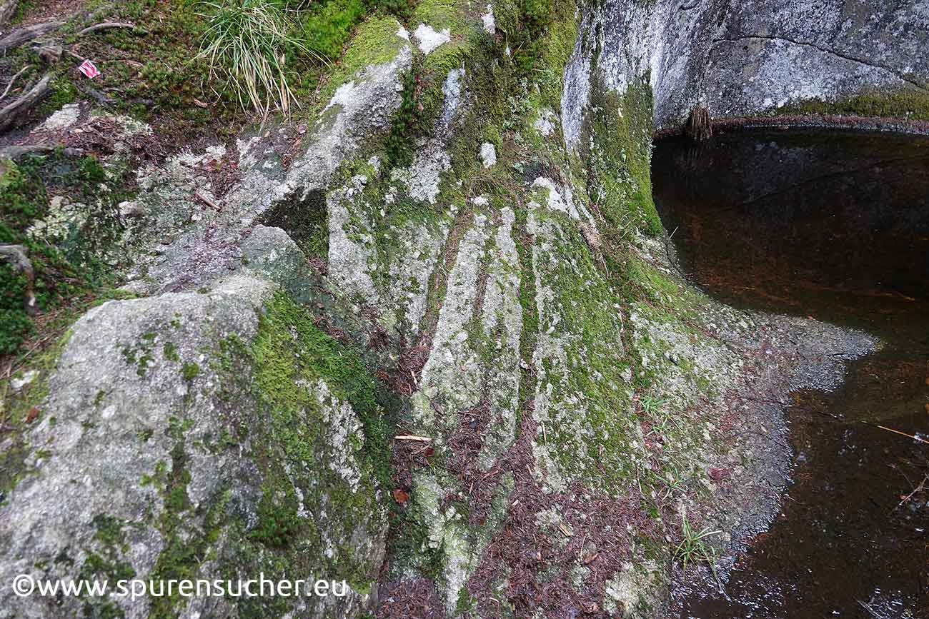 Seitlich befinden sich Riefen, die aus meiner Sicht nicht unkontrolliert durch das Darüberziehen von Felsen eingearbeitet wurden. Selbstverständlich kann man hierüber geteilter Meinung sein.