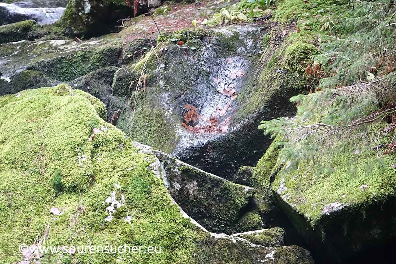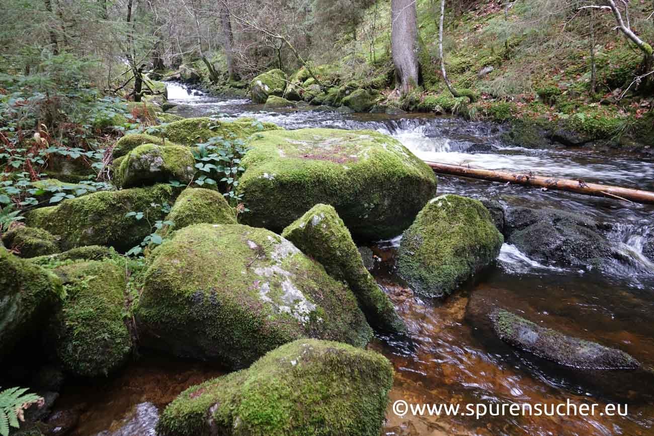 Auf der Höhe des Schwarzenbach-Wasserfalls im Südschwarzwald tauchen Becken auf, die von der Geologie als Strudellöcher bzw. Gletschermühle(n) bezeichnet werden.