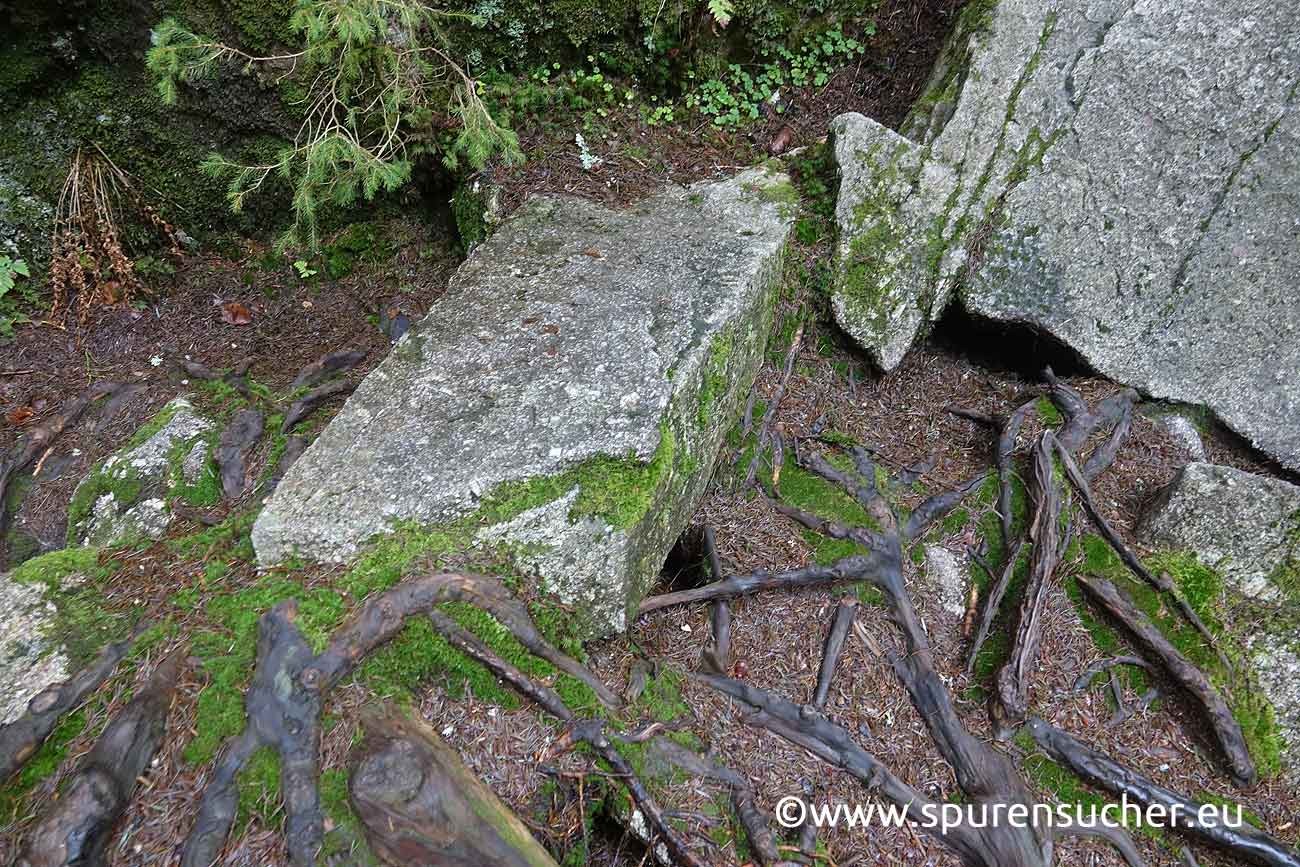 Stellenweise finden wir bearbeitete Felsen, die sämtliche Kriterien der natürlichen Formgebung missen lassen. Hier ein besonders geometrisch ausgefallens Exemplar.