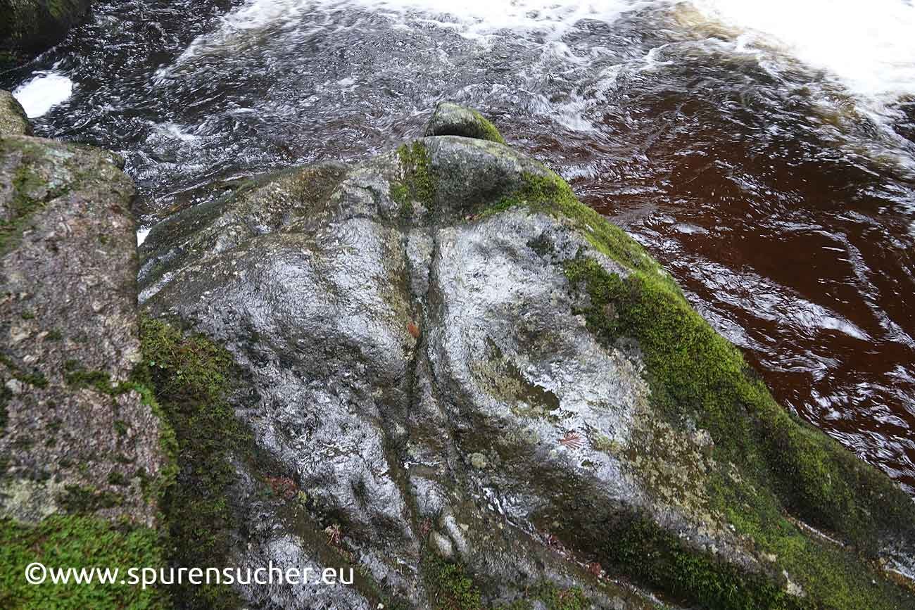 Für mich persönlich sind die Aushöhlungen keinesfalls natürliche Vorkommnisse, sondern das Ergebnis intelligenter und womöglich ausdauernder Arbeit am Rande eines idyllischen Wasserfalls, den unsere Ahnen bewusst genutzt hatten. Ich bin sogar der Meinung, dass der Großteil dieser Anlage künstlich angelegt ist. Überall finden sich Einkerbungen, geometrische Formen und menschliche Einflüsse bei der Gestaltung diverser Felsen, wie ich im einzelnen auch anhand der Abbildungen zeigen möchte. Aber geologische Wunder lassen sich eben leichter propagieren als archäologisch anspruchsvolle Recherchen, für die vermutlich weder der Wille noch die entsprechenden Mittel da sind.