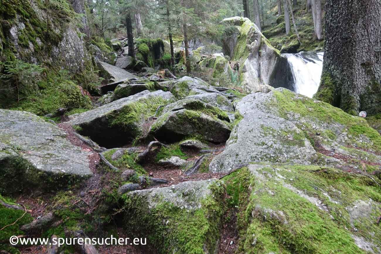 Die Häufung an Felsplatten seitlich des Schwarzenbaches in diesem Uferabschnitt ist besonders auffällig. Wie nach einem Abriss oder auf einer Baustelle. Im Hintergrund das erhöhte Becken nahe des Wasserfalls.
