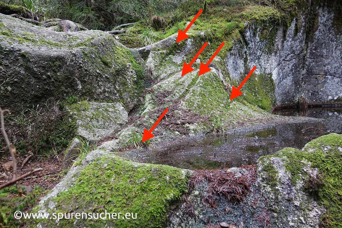Am Doppelbecken (linke Seite Wasserfall): Vielleicht hat man hier Überlaufrinnen eingearbeitet, um einen kontrollierten Abfluss bei zu großen Füllständen zu gewährleisten?