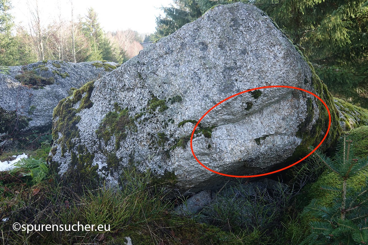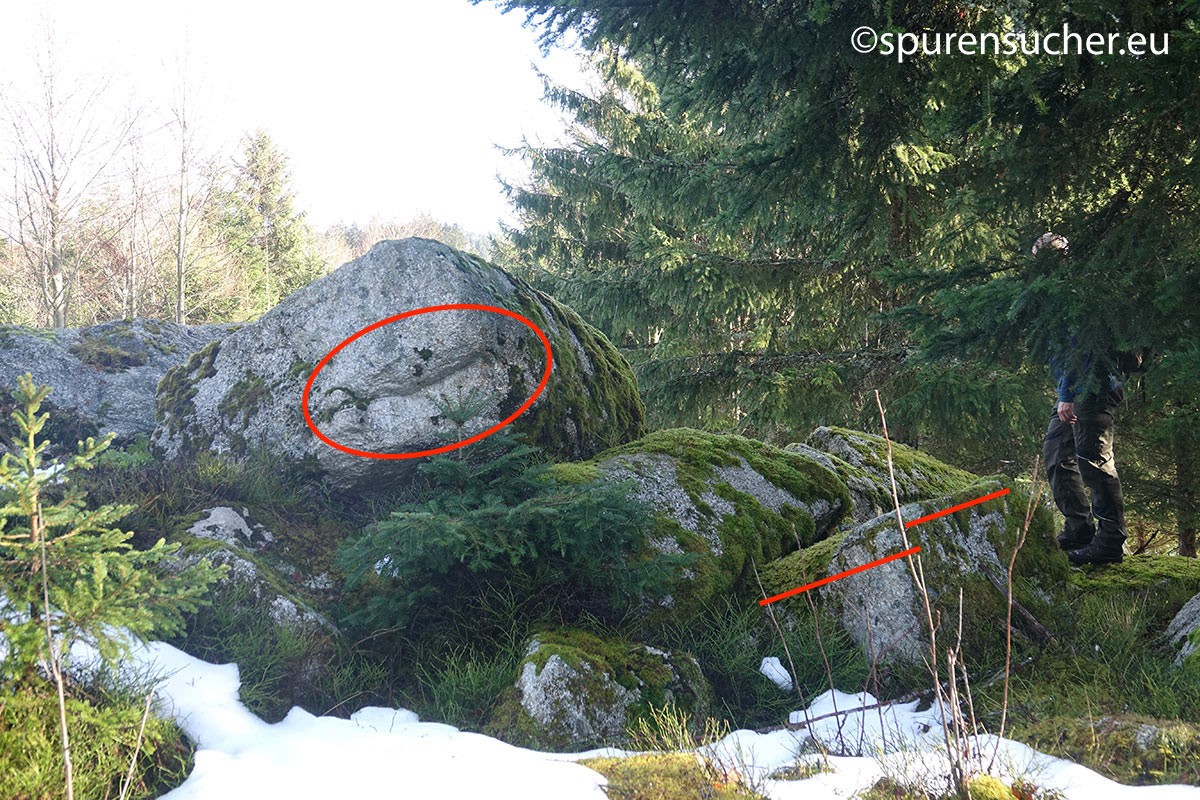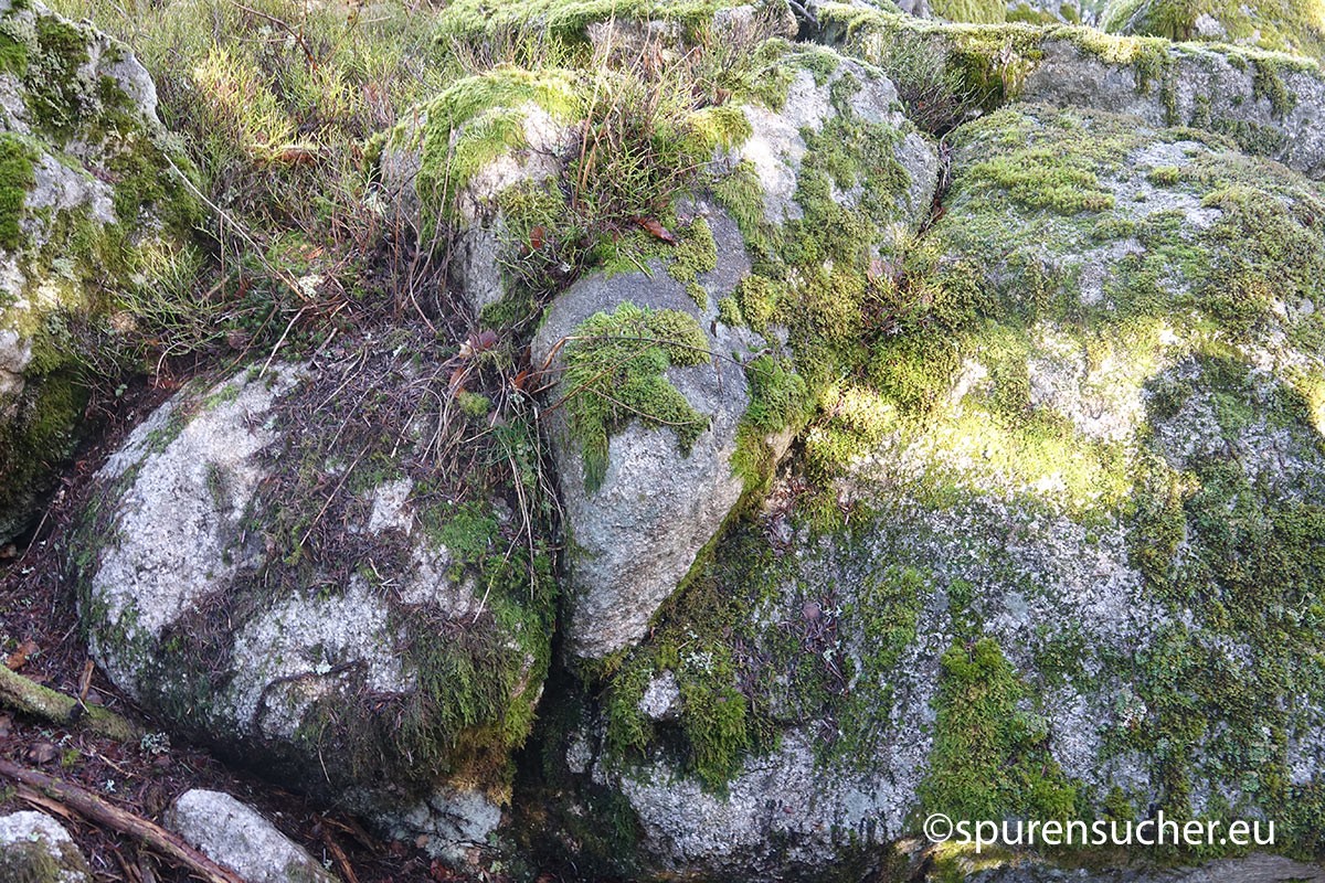Was hat es damit auf sich? Die Möglichkeit bestünde nach näherem Hinsehen, dass manche dieser Steine als Ortostaten dienten - aufrechte Steinstelen, die in der Archäologie häufig in Megalithgräbern wie Dolmen verwendet wurden. Sie könnten die Wände oder Seiten einer dieser bekannten Strukturen gebildet haben. Und ja, einige der anderen Felsen könnten sogar als Deckplatten gedient haben, um den "Unterstand" vor Witterungseinflüssen zu schützen. Wir jedenfalls haben potentielle Auflageflächen an Stelen oder stelenähnlichen Felsen gefunden, die mich an Dolmenstützen in der Normandie erinnerten. Da es sich um mehrere Fälle handelte, drängt sich der bewusste menschliche Eingriff an diesen Stellen auf.