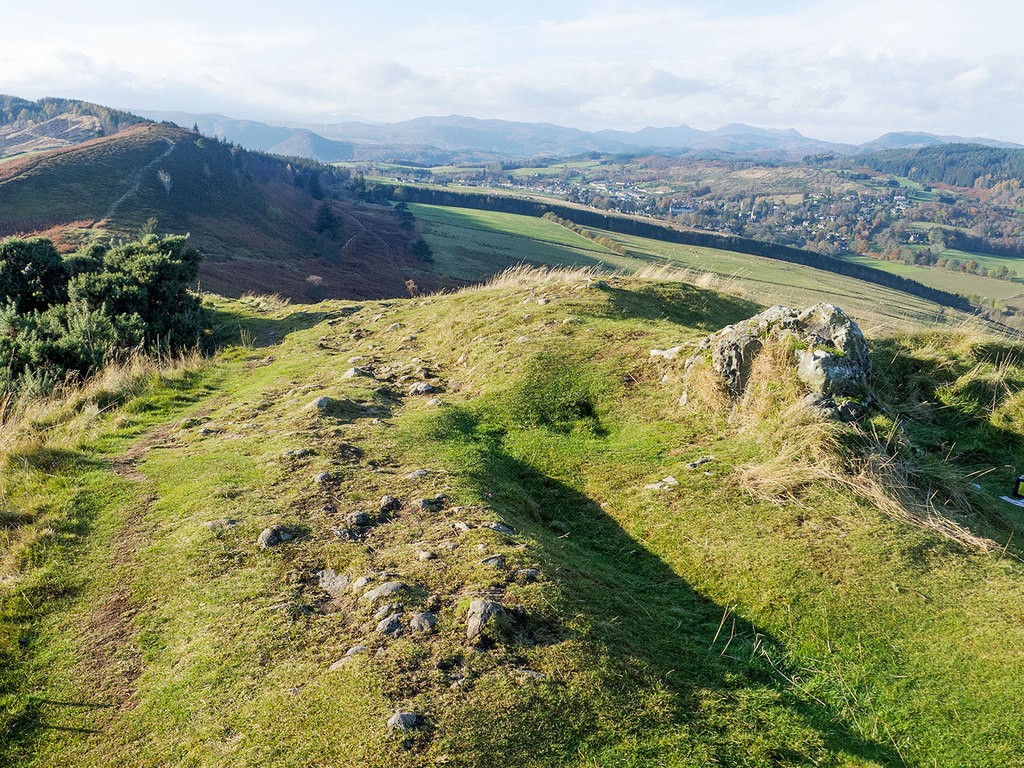 Die Befestigungswand von Knock Farril, (>> Bildquelle Common Licence: Julian Paren) – Nicht immer sind die verglasten Befestigungs-Mauern unter der grünen Vegetation auf Anhieb sichtbar: Diese verglaste Festung liegt auf einer niedrigen Anhöhe in der Nähe von Strathpeffer. Es gibt einen Fußweg entlang der umlaufenden Befestigungsmauer. Die ehemalige Festung wird in unterschiedlichen Nachschlagewerken ebenso unterschiedlich benannt. Die Stadt Strathpeffer kann man in der Ferne zu erkennen.