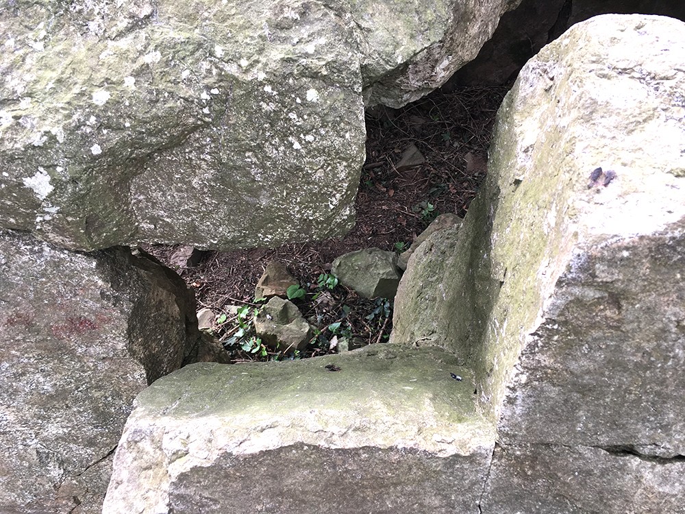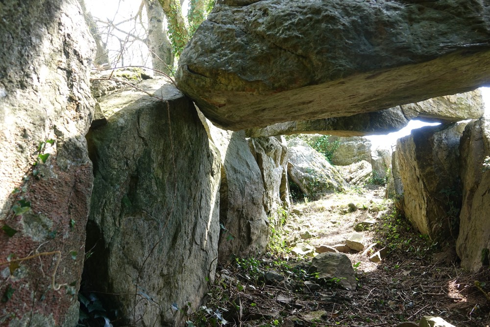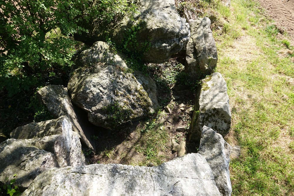 Eine ältere Bezeichnung des Standortes lautet "Autel des Druides" (Druidenaltar), was wiederum schlecht mit einer Grabstätte in Einklang zu bringen ist. Tatsächlich basiert die Herleitung der Wissenschaft auf der "Erfahrung" mit ähnlichen Konstruktionen, die zum Teil auch kammerähnliche Zwischenräume aufweisen, wie im nachfolgenden Bild vermutet werden könnte. In einem Abschnitt fehlt der oder die Deckenfelsen – möglicherweise gab es auch an dieser Stelle eine kammerähnliche Aushöhlung. Vielleicht auch nicht … who knows.